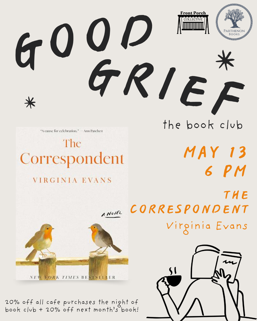 Good Grief is a book club for readers who love finding themselves in the pages. Book selections will span genres, topics, and tones (lighthearted and laughing to heartfelt and teary!). Monthly discussions will have a relaxed structure focused on personal reflection and the connection we feel to stories of life, from love to loss.